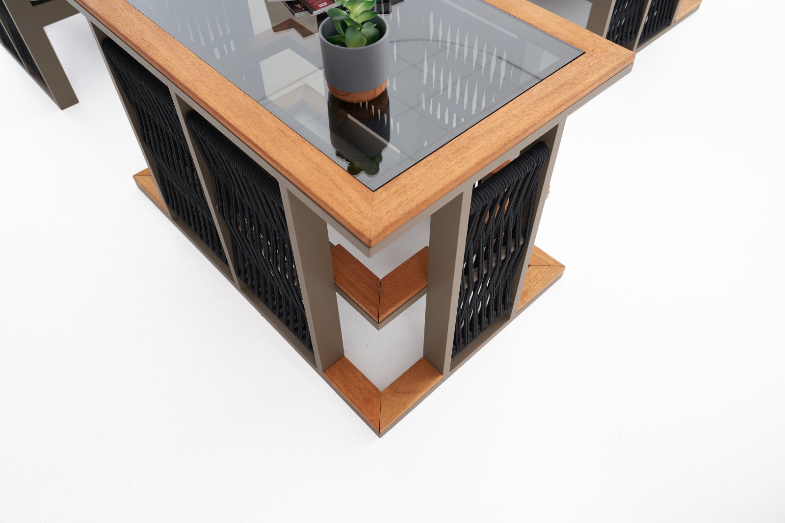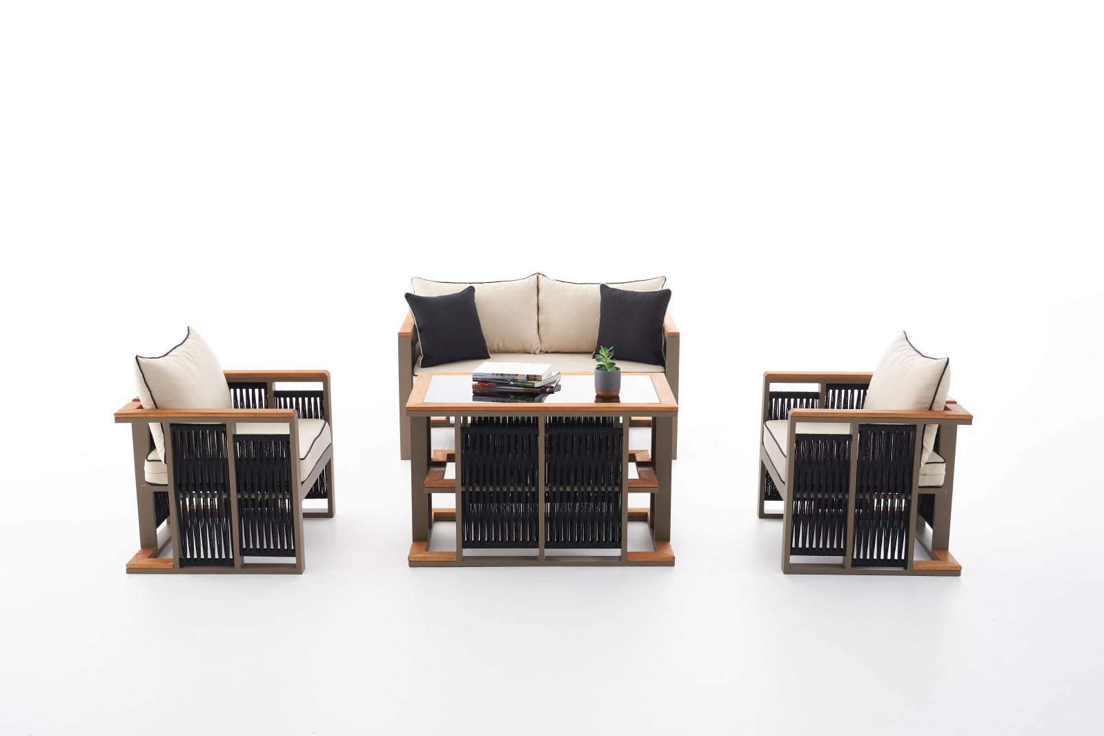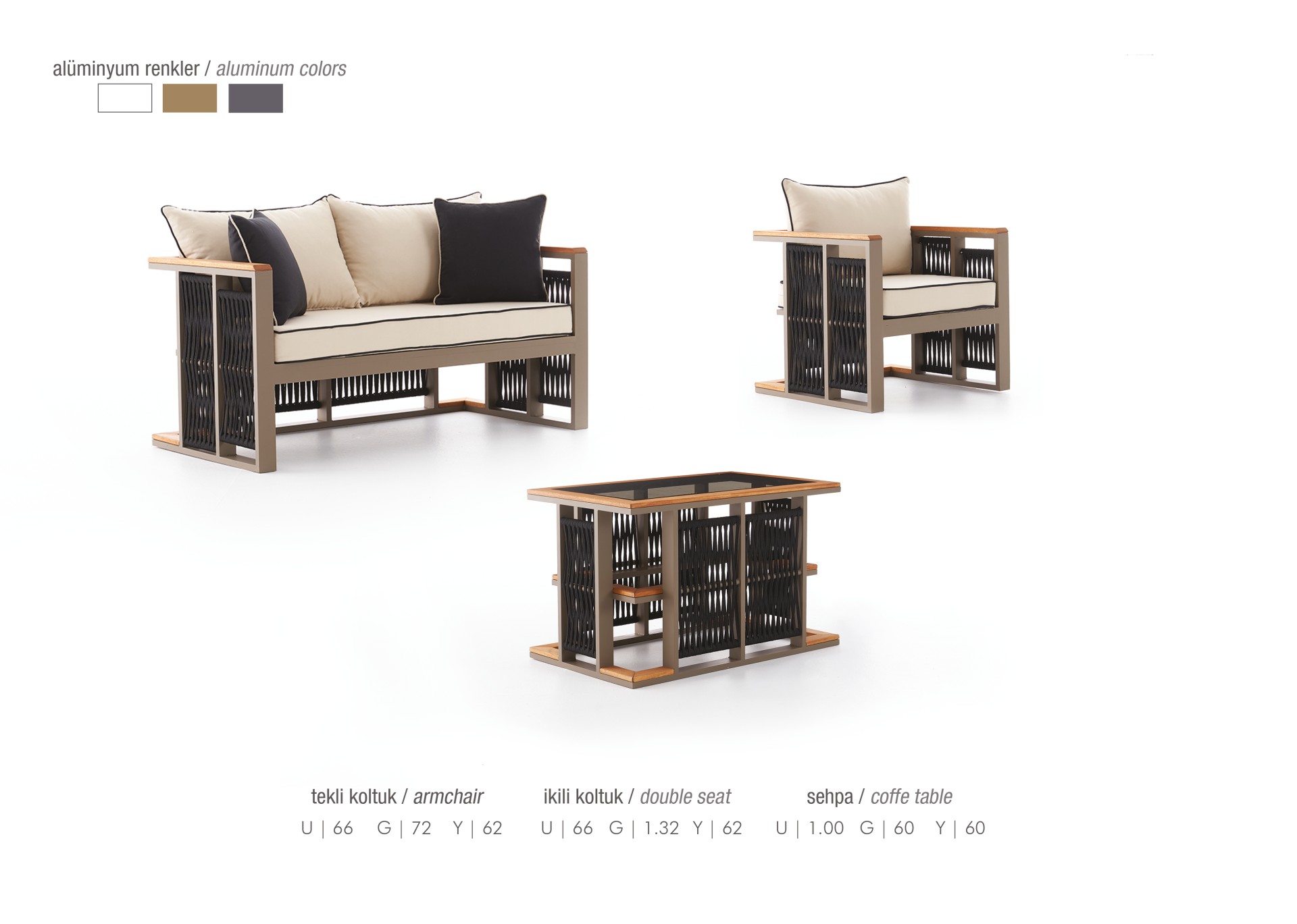 Buram buram ustalık ve kalite kokan tasarımıyla Dalyan koltuk takımı gerçek anlamda coşkulu bir havaya sahip. Minderlerindeki tek çizgilik hatlarla özgünlüğünü pekiştiren bu takımda, ahşap ve alüminyum adeta dans etmiş.
