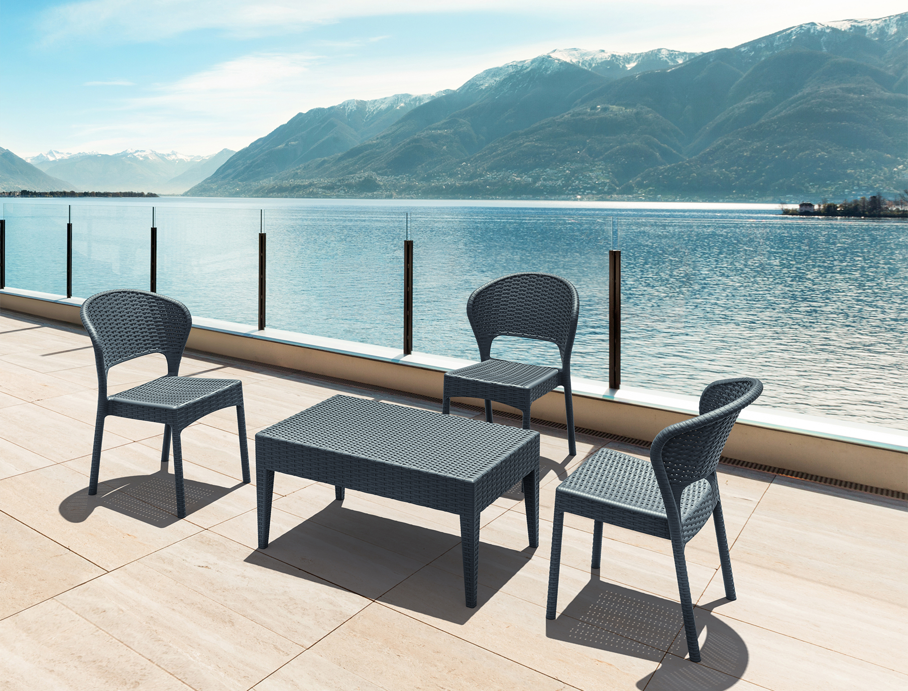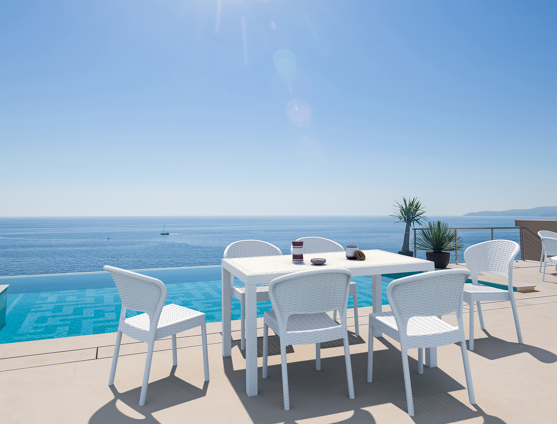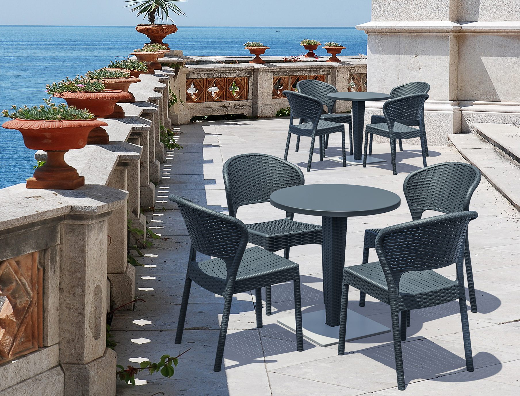 Polipropilen ve cam elyaf karışımdan mamul Daytona sandalye, rattan efektli ve mat yüzeylidir.