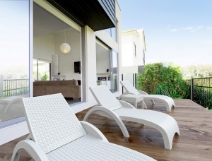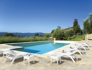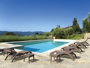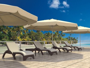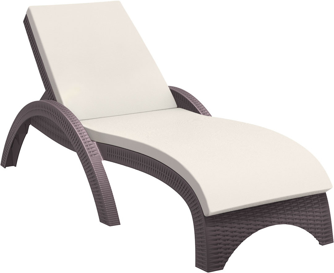 Kopolimer ve cam elyaf karışımından mamul Fiji şezlong, rattan efektli ve mat yüzeylidir.