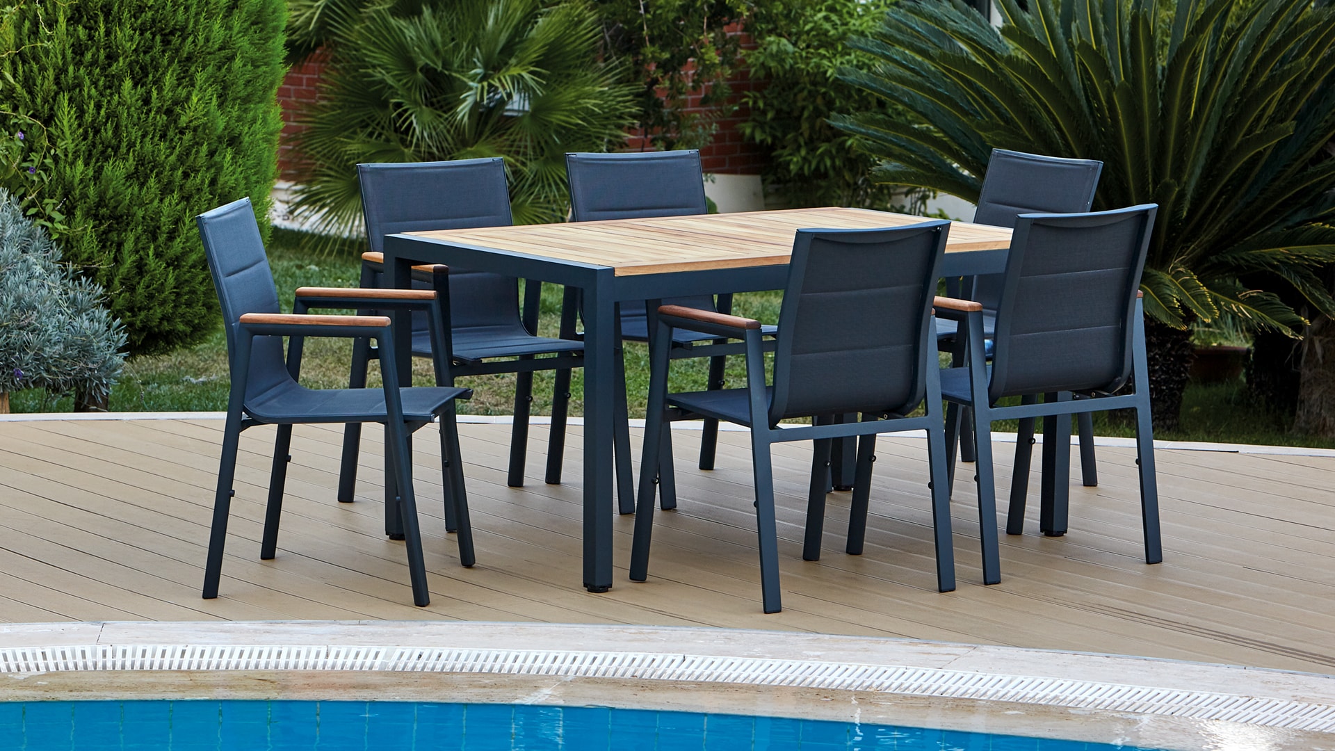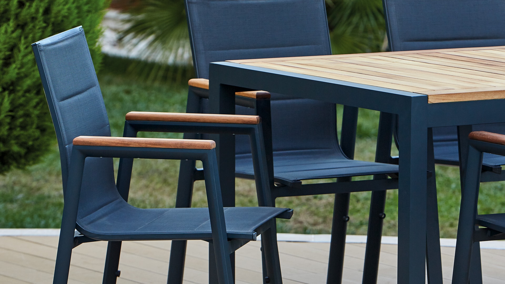 Alüminyum iskelet kullanılmıştır ve ahşap detaylarla şekillendirilmiştir, pas yapmaz.