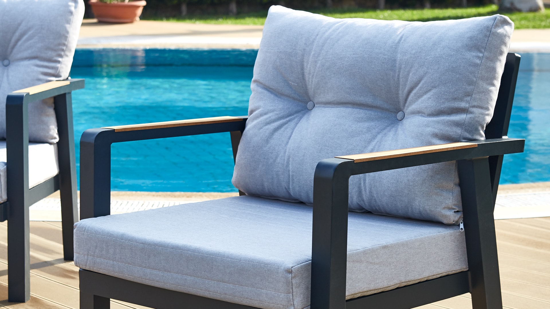 Alüminyum iskelet kullanılmıştır ve ahşap detaylarla şekillendirilmiştir, pas yapmaz.