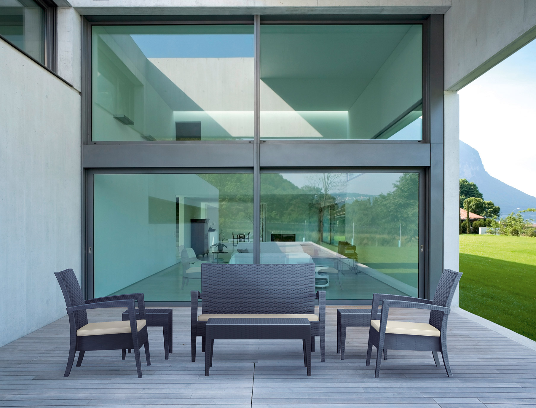 Kopolimer ve cam elyaf karışımından mamul Miami İkili Koltuk, rattan efektli ve mat yüzeylidir.