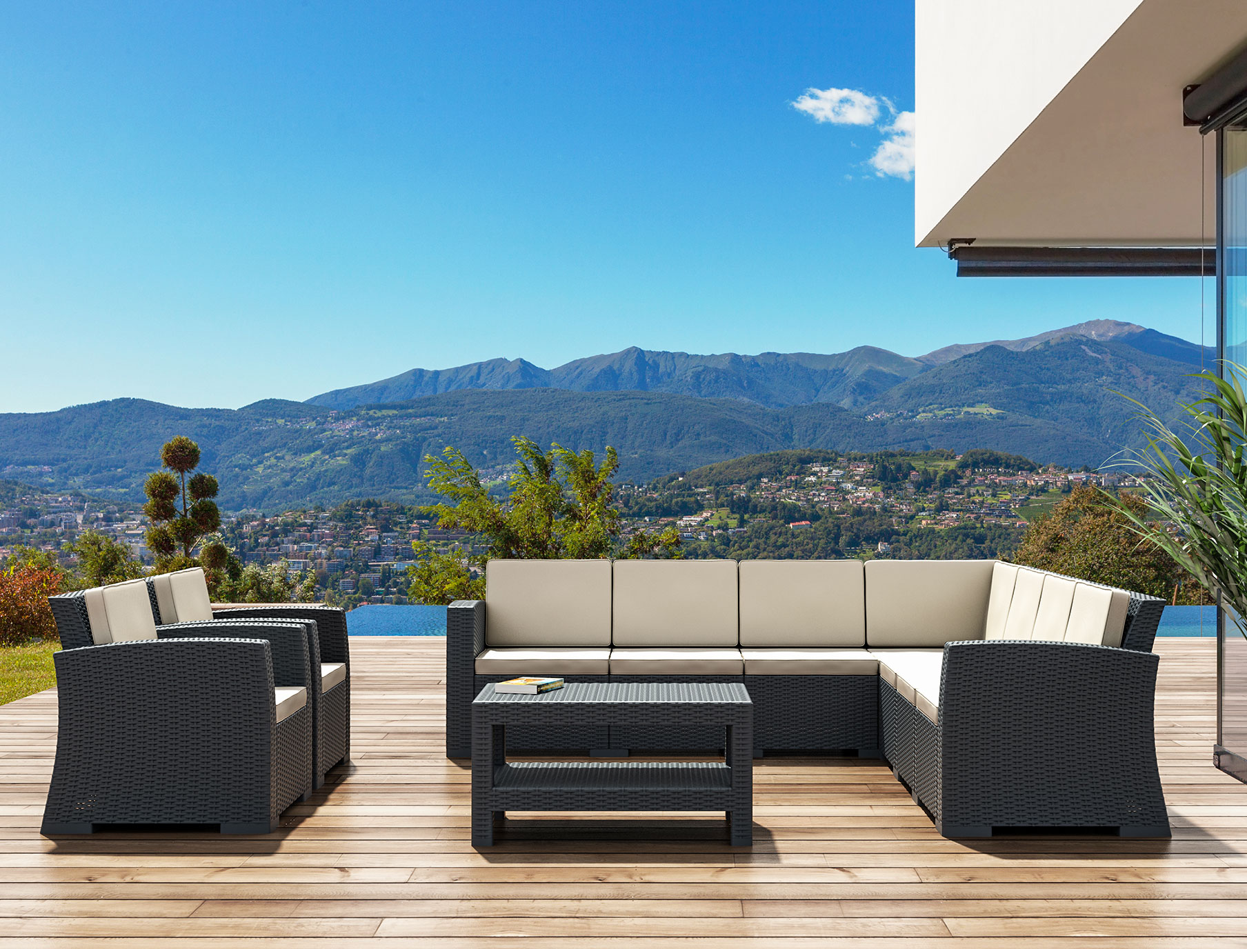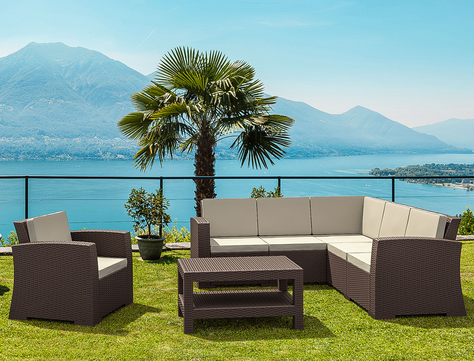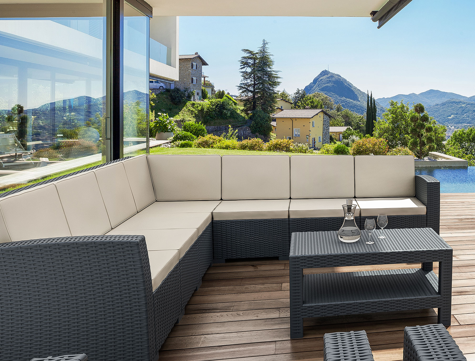 Kopolimer ve cam elyaf karışımdan mamul Monaco Köşe Koltuk, demonte, rattan efektli ve mat yüzeylidir.