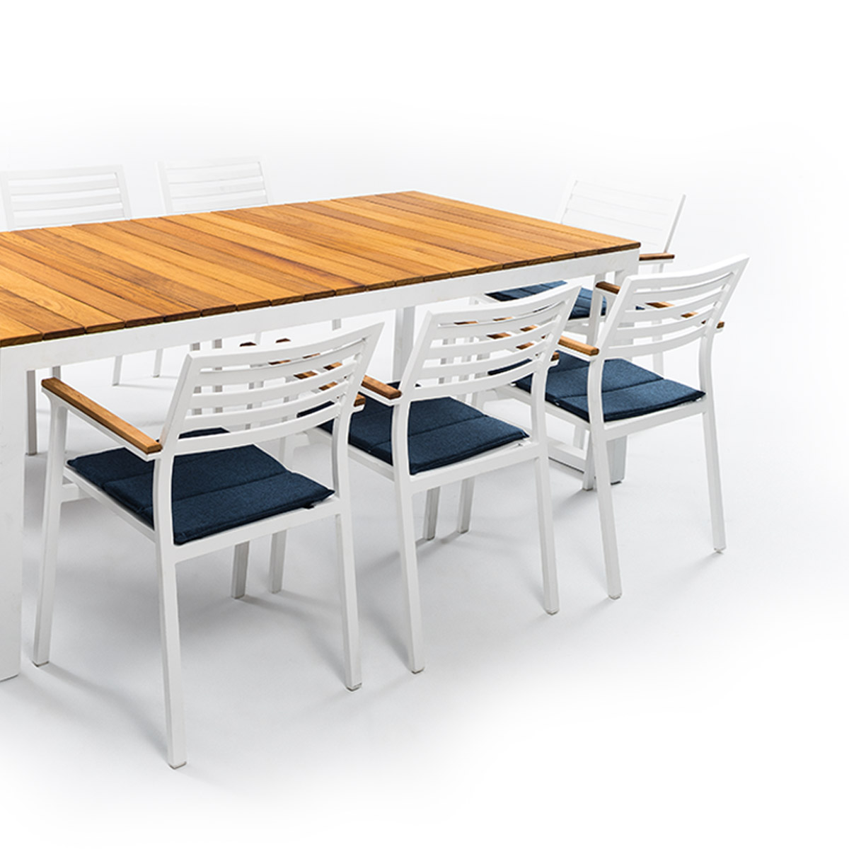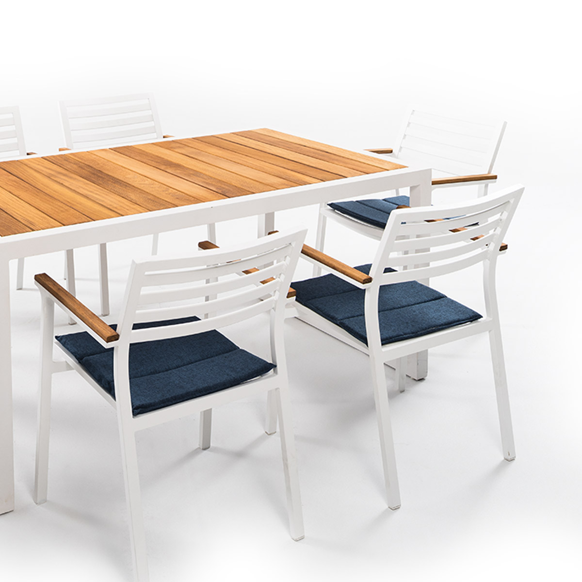 Sandalye kollarında güneş ve suya dayanıklı UV katkılı birinci kalite iroko malzeme kullanılmıştır.