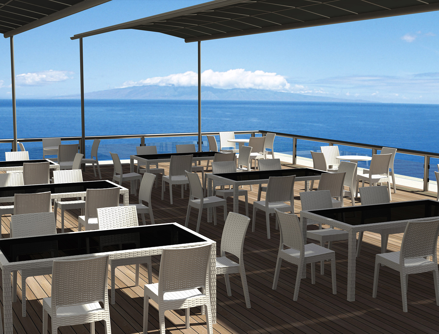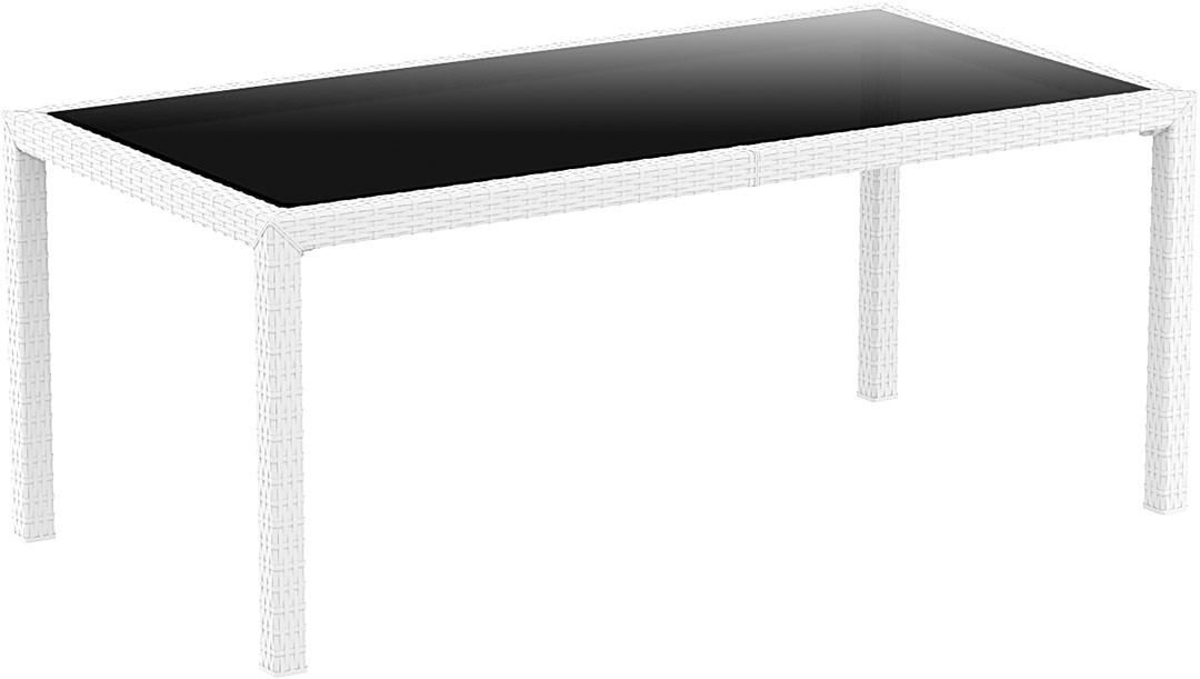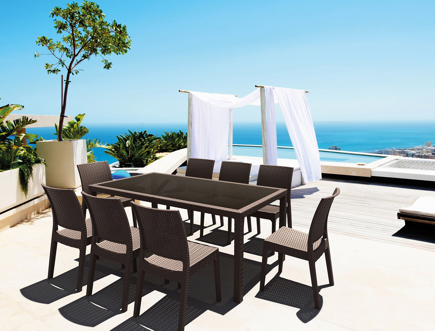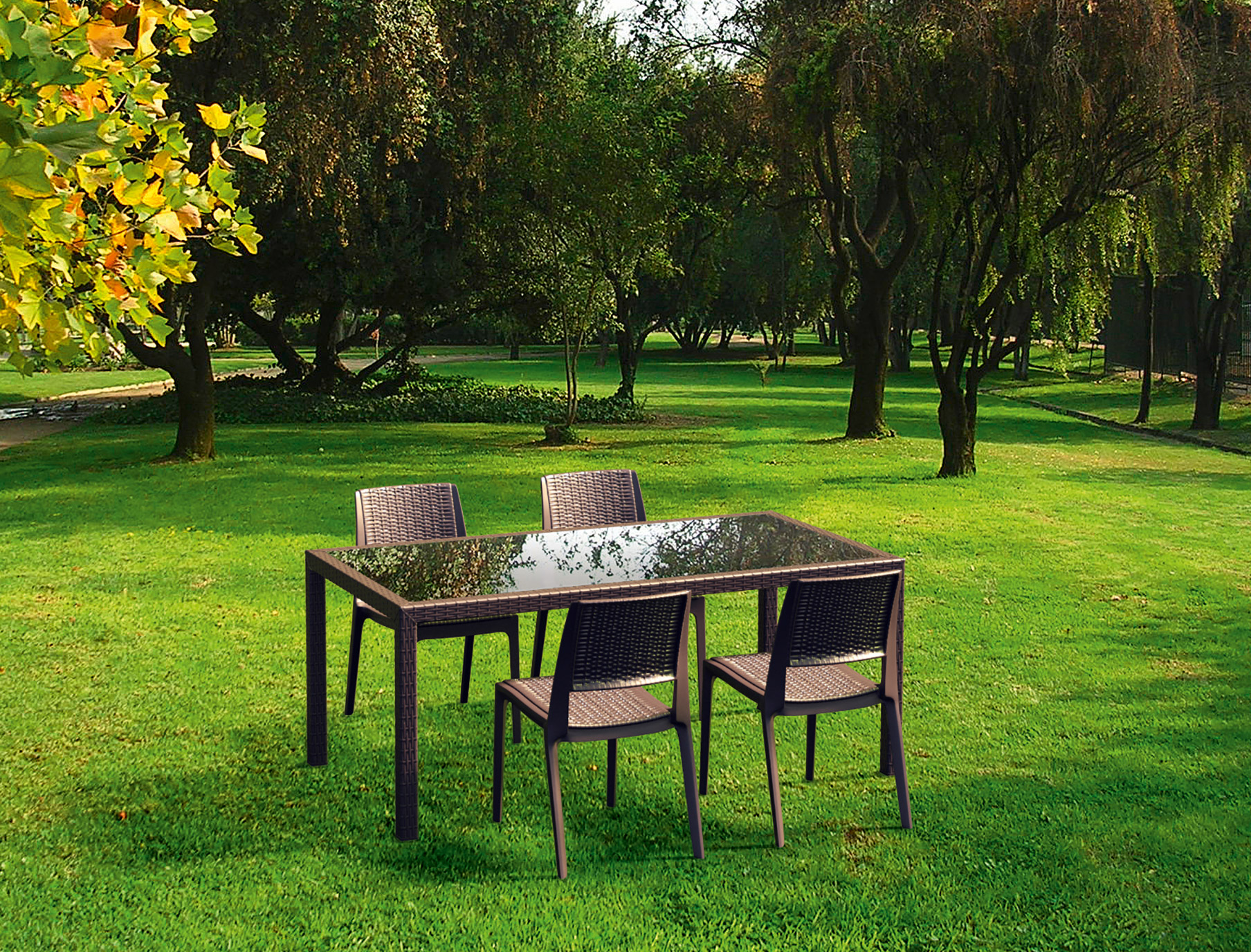 Kopolimer ve alüminyum karışımından mamul Tahiti masa, rattan efektli, demonte ve 5mm kalınlığında temperli cam yüzeylidir.